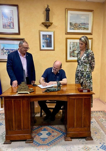 Rafael Louzan, presidente de la Real Federación Española de Fútbol firma en el libro de honor de la Asociación de Fiestas de Moros y Cristianos San Francisco de Asís de Crevillen