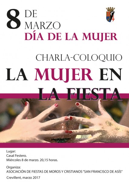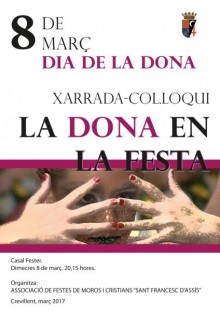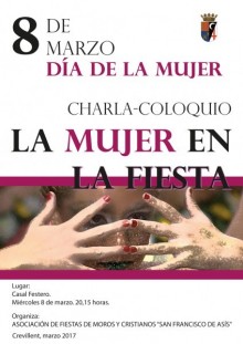 El miércoles 8 de marzo a las 20:15 en el Casal Festero y con motivo del Día Internacional de la Mujer tendrá lugar una charla coloquio bajo el título “La mujer en la Fiesta” donde se tratará la participación e importancia de la mujer en las fiestas de Moros y Cristianos.