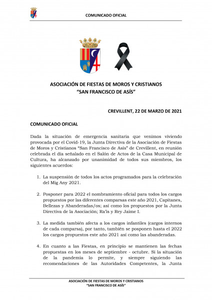 Dada la situación de emergencia sanitaria que venimos viviendo provocada por el Covid-19, la Junta Directiva de la Asociación de Fiestas de Moros y Cristianos “San Francisco de Asís” de Crevillent, en reunión celebrada el día señalado en el Salón de Actos de la Casa Municipal de Cultura, ha alcanzado por unanimidad de todos sus miembros, los siguientes acuerdos: